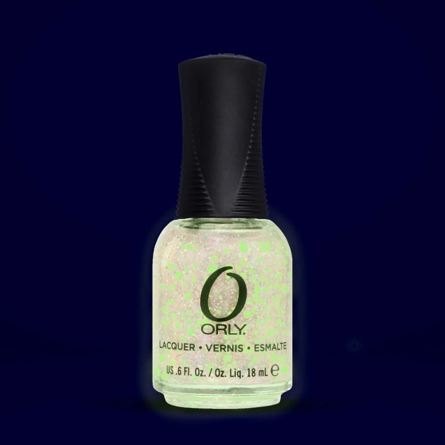 Throw it back to Saturday Night TV and mall neon vibes. All That is the glow-in-the-dark topper that shines brighter than the arcade marquee. Holo in the day, electric by night.Expose nails to a light source to activate the glowing effect. Watch the glitters glow yellow-green.